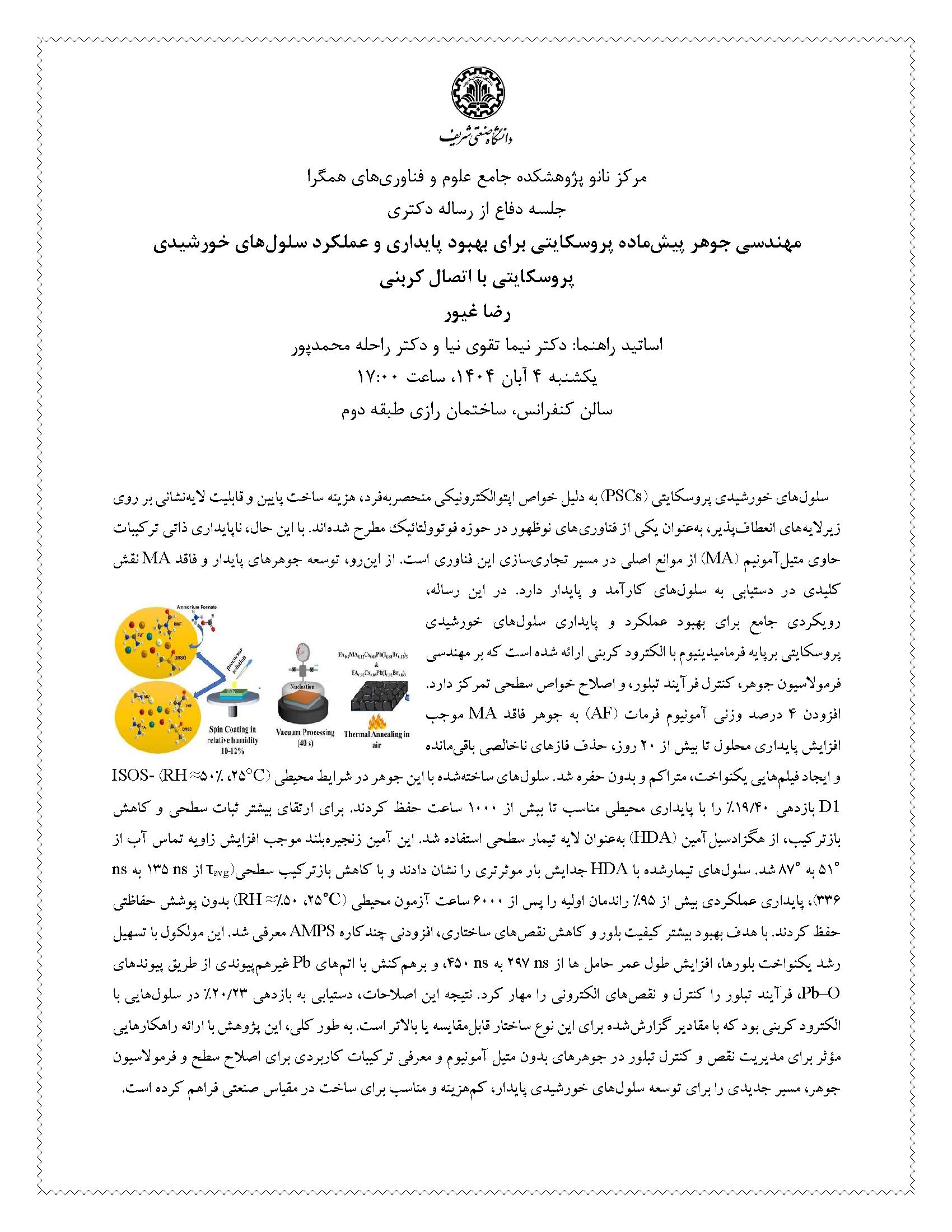 جلسه دفاع از رساله دکتری جناب آقای رضا غیور تحت راهنمایی آقای دکتر نیما تقوی نیا و خانم دکتر راحله محمدپور با عنوان "مهندسی جوهر پیش ماده پروسکایتی برای بهبود پایداری و عملکرد سلولهای خورشیدی پروسکایتی با اتصال کربنی" در روز یکشنبه 4 آبان ماه 1404 ساعت 17 عصر در سالن کنفرانس پژوهشکده همگرا بصورت حضوری برگزار خواهد شد.
