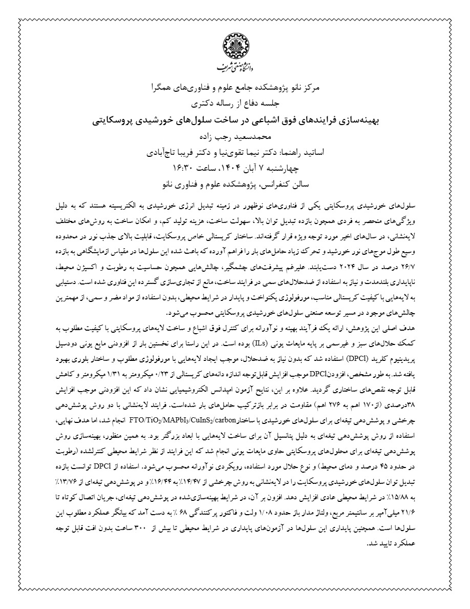 جلسه دفاع از رساله دکتری جناب آقای محمد سعید رجب زاده  تحت راهنمایی آقای دکتر نیما تقوی نیا و خانم دکتر فریبا تاج آبادی با عنوان "فرآیندهای ایجاد فوق اشباعی در ساخت سلول خورشیدی پروسکایتی مقیاس بزرگ " در روز چهارشنبه 7 آبان ماه 1404 ساعت 16:30 عصر در سالن کنفرانس پژوهشکده همگرا بصورت حضوری برگزار خواهد شد.