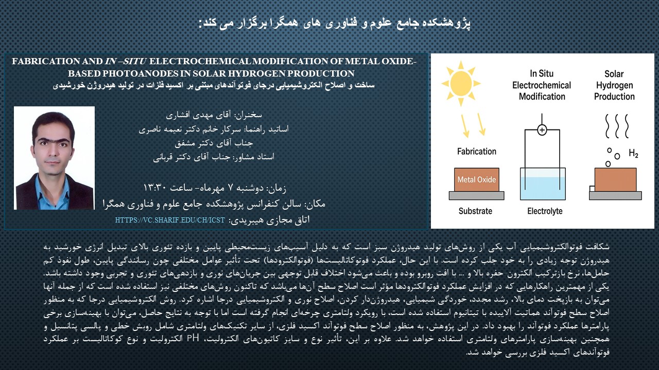 سمینار هفتگی روز دوشنبه 7 مهر با ارائه گزارش پیشرفت آقای مهدی افشاری  با موضوع " ساخت و اصلاح الکتروشیمیایی در جای فوتوآند های مبتنی بر اکسید فلزات در تولید هیدروژن خورشیدی " تحت راهنمایی خانم دکتر ناصری و آقای دکتر مشفق راس ساعت 13:30 به صورت حضوری  در سالن کنفرانس پژوهشکده همگرا برگزار خواهد شد.
