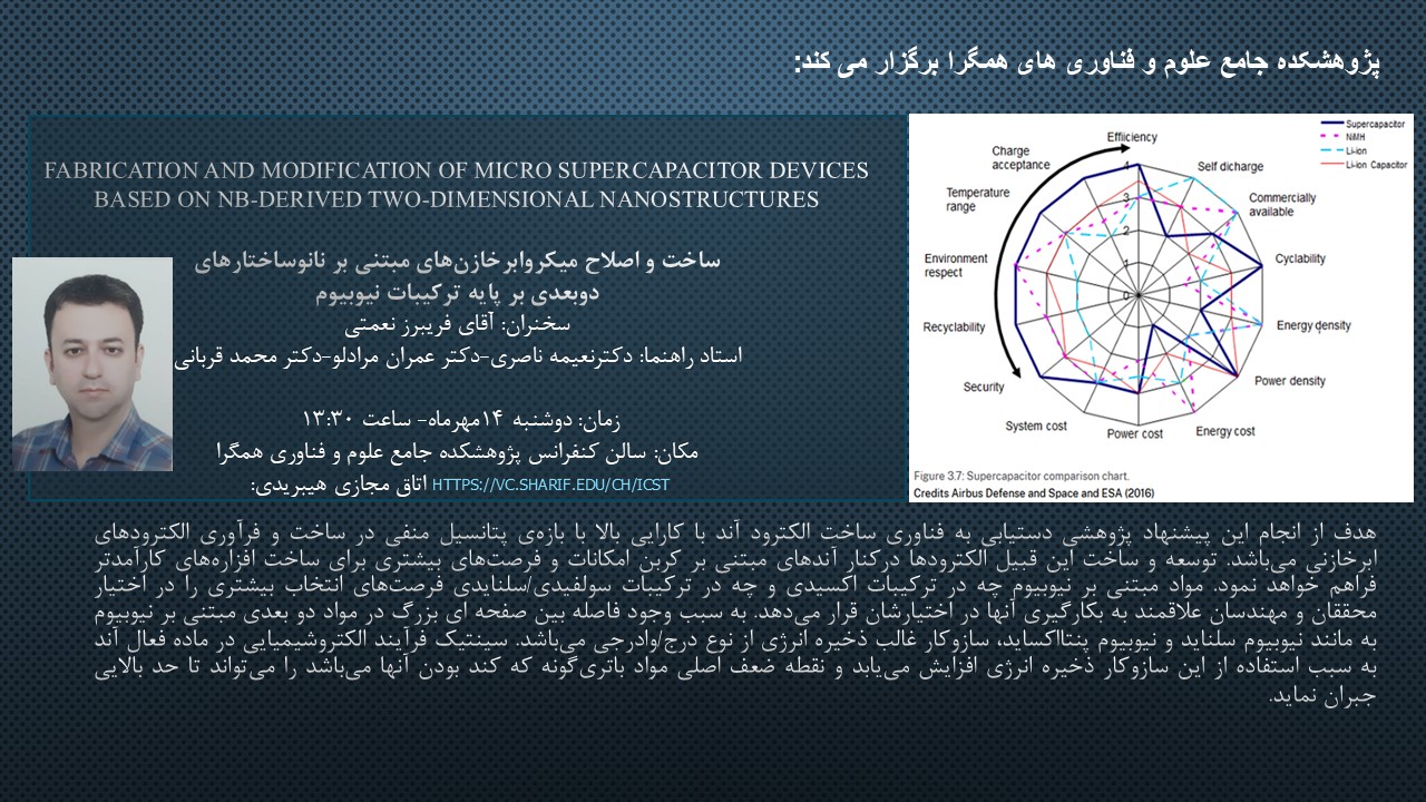 سمینار هفتگی روز دوشنبه 14 مهر1404 با ارائه گزارش پیشرفت آقای فریبرز نعمتی با موضوع "ساخت و اصلاح میکرو ابرخازن های مبتنی بر نانوساختارهای دو بعدی بر پایه ترکیبات نیوبیوم" تحت راهنمایی خانم دکتر ناصری، آقای دکتر مرادلو و آقای دکتر قربانی راس ساعت 13:30 به صورت حضوری در سالن کنفرانس پژوهشکده همگرا برگزار خواهد شد.